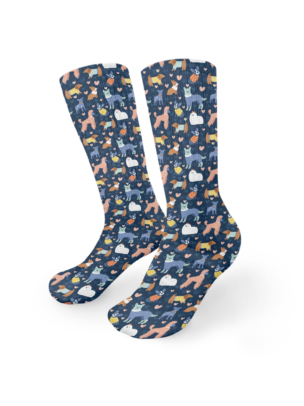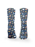 These crew socks are a medium thickness (not too thick, not too thin) and are printed all over. They are a versatile sock that is fun to wear in the gym, walking down the street, in bed and everywhere in between. Fully stretched they will reach to the base of your calf, or slouch it down a little if you prefer something more in between.
